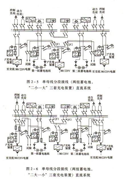 (5)方案五:單母線分段[兩組蓄電池,二小(1﹟2﹟充電裝置)一大(3﹟充電裝置)三套充電裝置,也可三套同容量]接線,見圖2-5。特點:接線可靠、操作方便靈活。每段母線設一組蓄電池和一套充電裝置,另設一套公用充電裝置,可用于任一組蓄電池充電。公用充電裝置是分別經空氣斷路器QFl、QF2接到任一組蓄電池回路,充電裝置為二小(工作充電裝置)一大(公用充電裝置),即小的充電裝置按浮充電要求設計小容量,大的充電裝置按均衡充電要求設計大容量。每段母