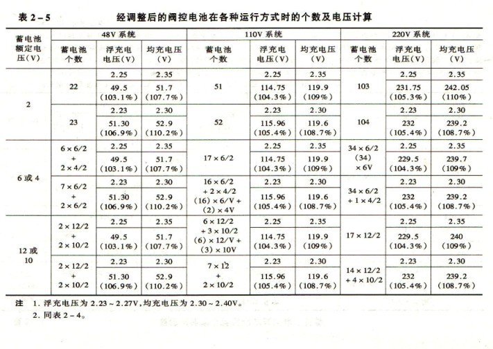 (2)蓄電池的個(gè)數(shù)均少于一般鉛酸蓄電池個(gè)數(shù),對(duì)減少安裝與試驗(yàn)工作、減少工程投資都較有利。根據(jù)表2-4,每個(gè)電池浮充電壓按2.25V,均衡充電電壓2.35V計(jì)算。母線電壓有個(gè)別情況要求偏移電壓范圍較大。為此,可將浮充電電壓作少量增減,對(duì)均充電壓由2.35V降至2.30V,均充時(shí)間可能略為延長(zhǎng)一些。據(jù)一些電池廠試驗(yàn),延長(zhǎng)2~3h,即可達(dá)到均衡充電要求。經(jīng)調(diào)整后的電池個(gè)數(shù)與電壓的計(jì)算,見(jiàn)表2-5。