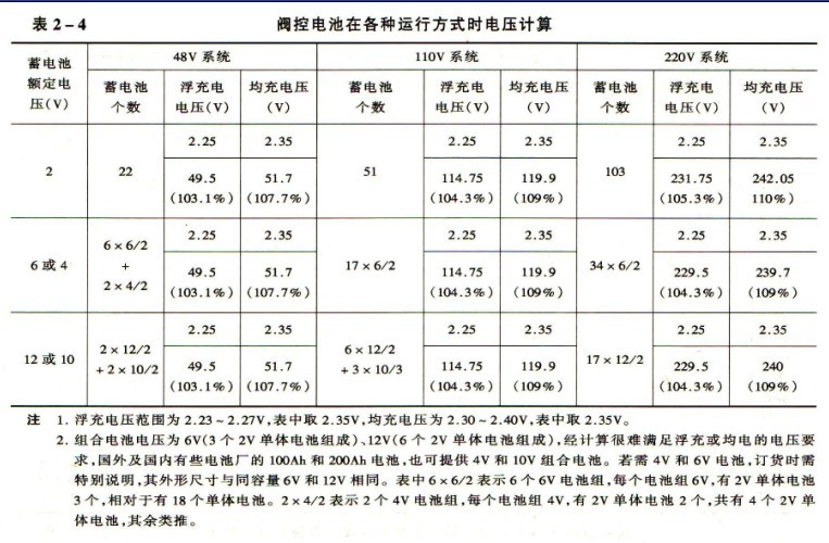 閥控電池在各種運(yùn)行工況時(shí)電壓的計(jì)算,見(jiàn)表2-4。