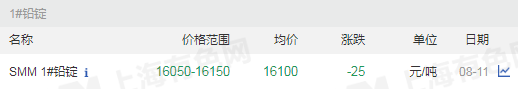 8月11日 周二   鉛價漲-25元/噸,均價16100元/噸