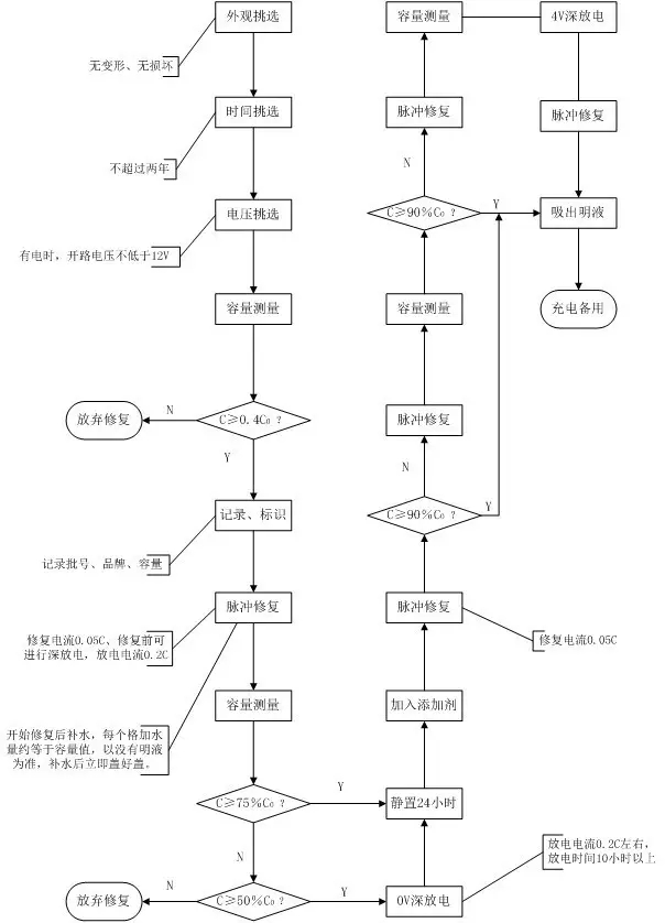 (3)容量不低于額定容量的40%,容量低于額定容量40%的電池,修復后難以達到理想容量值。